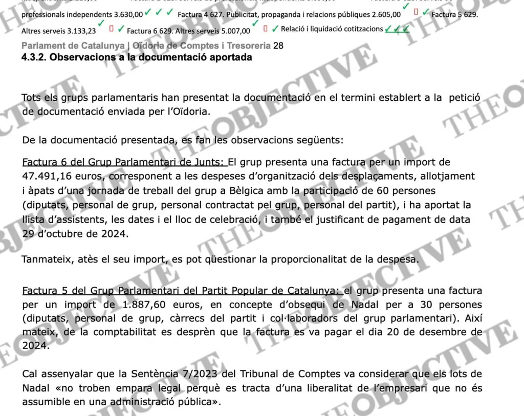 La Oïdora de Comptes (Auditoría de Cuentas) del Parlamento catalán ha publicado su informe anual sobre el gasto que reportan los grupos parlamentarios. El documento, al que ha tenido acceso THE OBJECTIVE, pone de relieve una factura de 47.491,16 euros de Junts per Catalunya correspondiente a los «gastos de organización de desplazamientos, alojamientos y almuerzos de una jornada de trabajo del grupo en Bélgica con la participación de 60 personas» y concluye que «debido a su importe, se puede cuestionar la proporcionalidad de su desembolso».