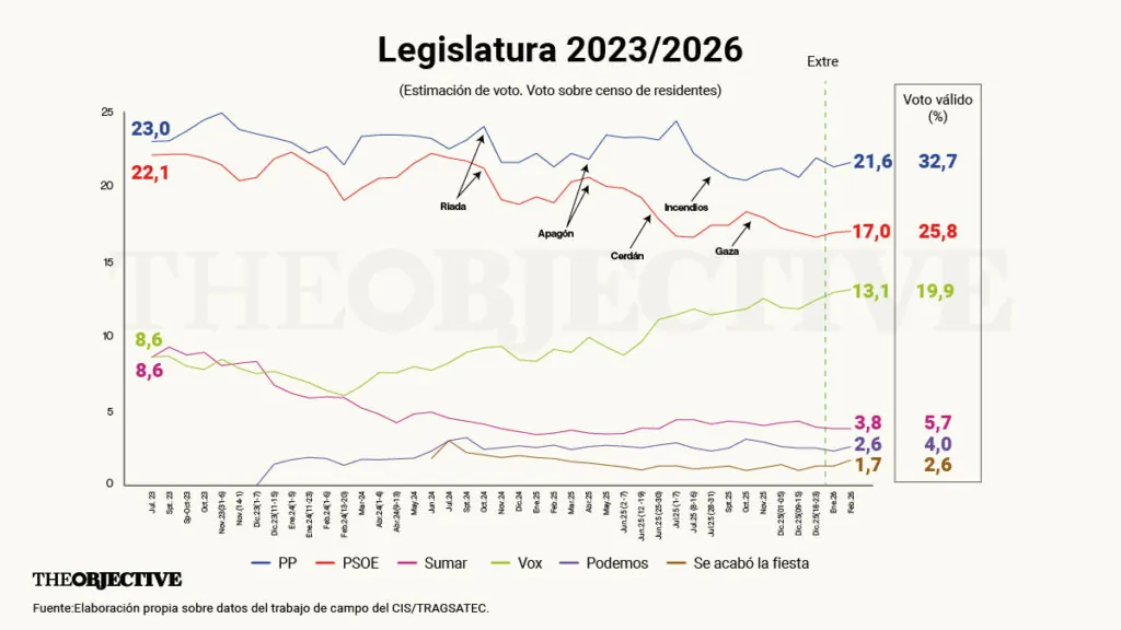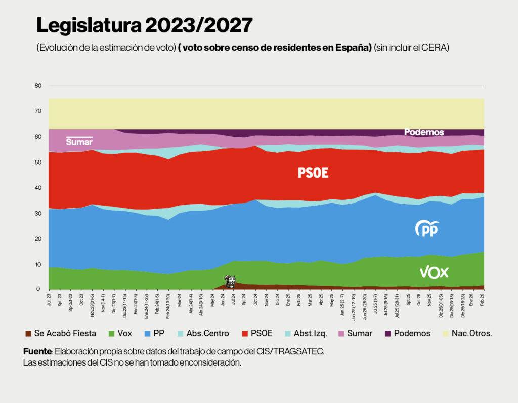 Ciñéndonos a la estimación de voto, se consolida la perspectiva de una mayoría PP+Vox. Vox al alza, mientras que el PP no sale de su electorado cristalizado alrededor del 22% del censo electoral, por debajo de su resultado en 2023. El PP pierde apoyos en dirección a Vox desde 2024, sin encontrar remedio. Como vimos en enero, Vox ya capta apoyos en los sectores templados del centro derecha.
