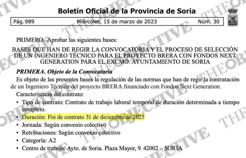 Las bases se publicaron en el Boletín Oficial de la Provincia de Soria el 15 de marzo de hace tres años. En ellas se especificó que dicho trabajo tendría una «duración determinada» y sería «a tiempo completo». Por lo tanto, el puesto en las oficinas del ayuntamiento no era indefinido, sino únicamente «temporal», de categoría A2 y concluiría a finales de 2025. Es decir, el contrato tendría una duración de dos años y medio. Este paso administrativo, con el que se dio publicidad a esta oposición laboral, llevó la firma de Carlos Martínez en calidad de regidor de Soria.
