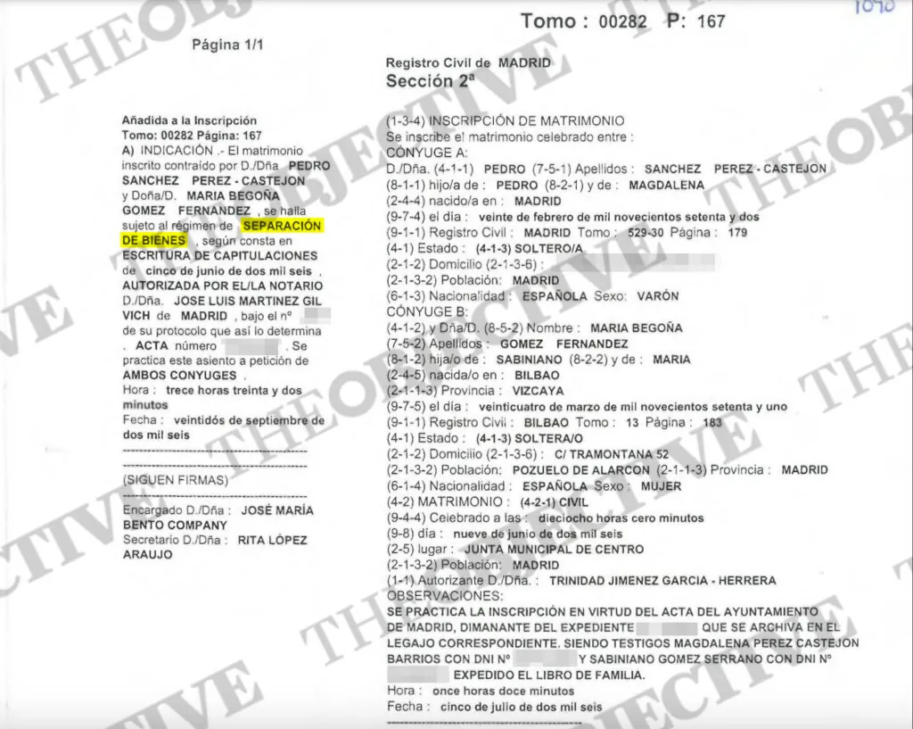 Begoña Gómez y Pedro Sánchez están casados en separación de bienes. Así lo confirma el certificado literal de matrimonio aportado al juez Juan Carlos Peinado, que investiga a la esposa del presidente del Gobierno por cuatro delitos. El documento al que ha tenido acceso THE OBJECTIVE está incluido en el sumario del caso. El magistrado solicitó la información en noviembre para aclarar el régimen matrimonial. En la providencia insistió en que se incluyeran las anotaciones marginales.