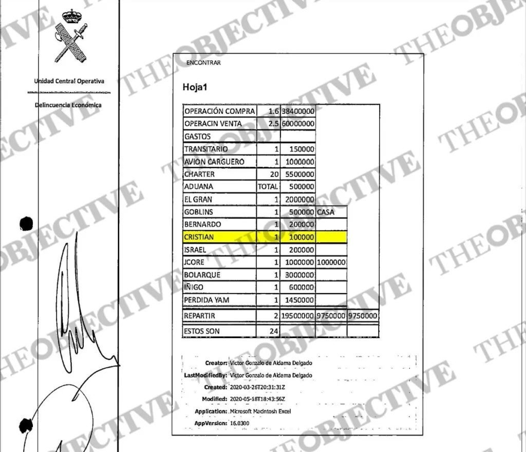 El documento se creó en marzo, durante los días en los que se adjudicaron los contratos otorgados por Puertos del Estado y Adif, pero la última modificación tuvo lugar el 18 de mayo de 2020, seis días después de que se publicara el último contrato en la Plataforma de Contratación del Sector Público. El texto detalla una serie de gastos que podrían derivarse del negocio de las mascarillas y que incluye diferentes nombres, entre los que destaca el de Cristian, que habría recibido 100.000 euros.