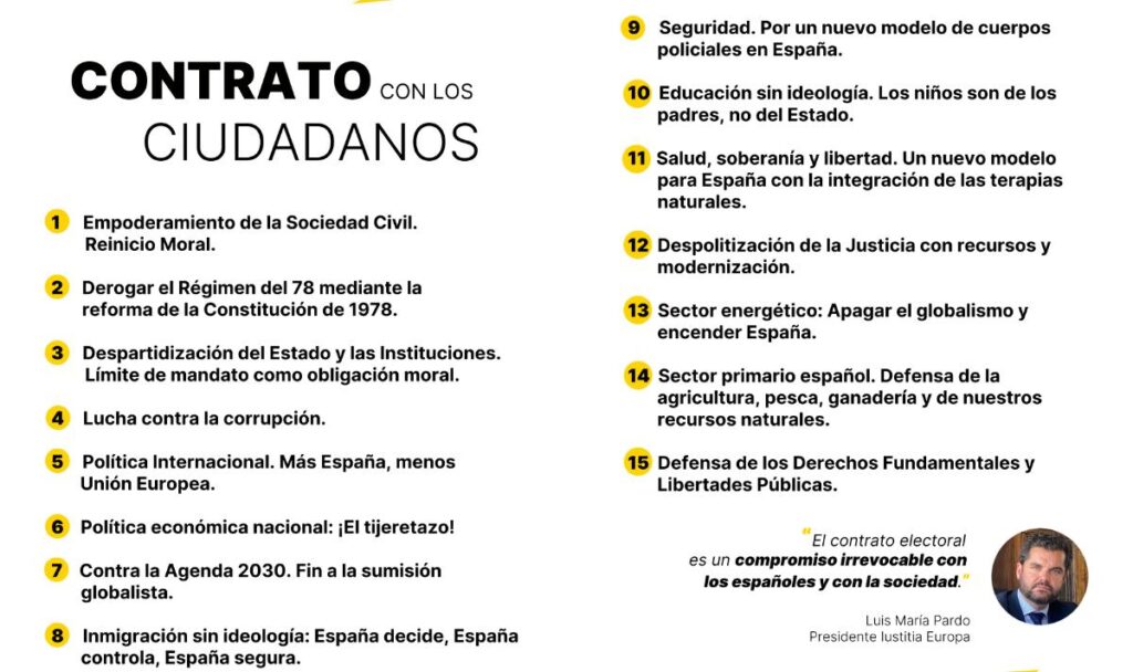 Recuperar España desde la sociedad. Iustitia Europa ha presentado este sábado en el Teatro Amaya de Madrid un contrato electoral con la ciudadanía. Con este paso, da el salto definitivo de los tribunales a la política para liderar un «reinicio moral». La organización que preside el abogado Luis María Pardo está personada como acusación popular en varias de las causas judiciales que cercan al Gobierno y a su presidente, Pedro Sánchez. Entre sus propuestas destacan el posicionamiento contra la Agenda 2030 y «la sumisión globalista», el control de la inmigración, un nuevo modelo de seguridad policial y la defensa del sector primario.