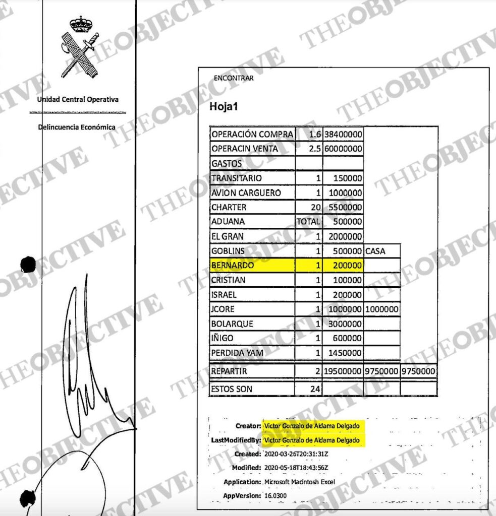 «Al margen de la correlación temporal con estas adjudicaciones, tanto el título de este documento, mascarillas, como su contenido (…), se vincularía con los hechos que dieron origen a la presente causa, ya que el mismo parece contemplar una serie de gastos derivados de este negocio», insiste la UCO en un informe al que ha tenido acceso THE OBJECTIVE. En la hoja de Excel elaborada por Aldama se incluye el coste de las mascarillas y el dinero que se iba a conseguir gracias a la venta, 60 millones de euros.