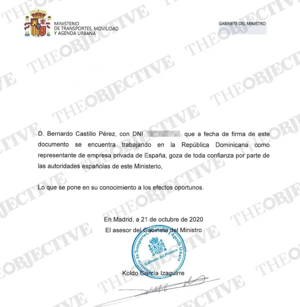 La relación del socio dominicano de Aldama con la trama fue más allá del negocio de mascarillas. Castillo llegó a presentarse como «asesor del Ministerio de Transportes, Movilidad y Agenda Urbana de España». Meses después del ofrecimiento de las mascarillas, en octubre de 2020, Koldo García le firmó una carta de recomendación con el sello del Ministerio en la que asegura que se encuentra «trabajando en la República Dominicana como representante de empresa privada de España» y que «goza de toda confianza por parte de las autoridades españolas».