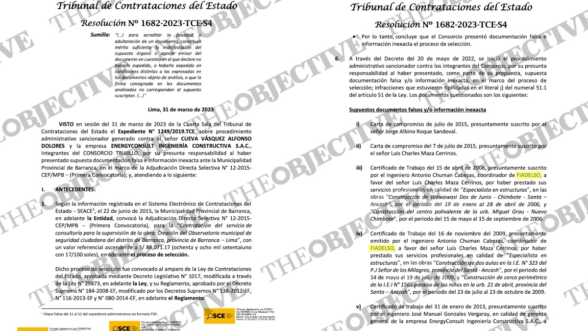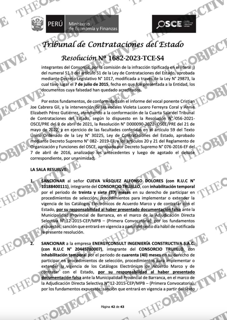 Según la resolución, a la que ha accedido THE OBJECTIVE, tanto el empresario, de nombre Alfonso Cueva Vásquez, como la empresa utilizaron diversos avales y certificados de trabajo que nunca existieron. Como consecuencia, el órgano peruano encargado de resolver conflictos sobre contrataciones inhabilitó a Cueva y Energyconsult. La resolución tiene fecha de 31 de marzo de 2023 y se centra una contratación de julio de 2015.