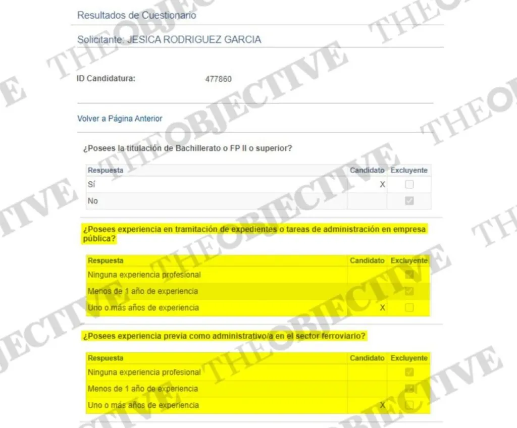 El Grupo Tragsa ofertó diez puestos de administrativo en Madrid, aunque no logró cubrir todas las plazas. Para optar a ellas se requería el título de especialista de Formación Profesional o Bachillerato. Además, era imprescindible contar con al menos un año de experiencia en tareas de administración en una empresa pública y otro año de experiencia previa como administrativo en el sector ferroviario. Curiosamente, dos exigencias que cumplía Jésica Rodríguez.
