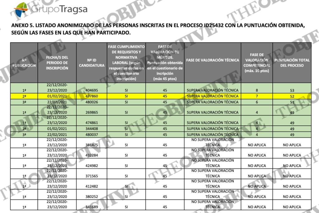 Tragsatec publicó por primera vez la convocatoria el 22 de diciembre de 2020, «resultando necesario publicar hasta tres veces más la misma oferta para obtener candidaturas». Lo hizo tanto en la web externa del Grupo Tragsa como en su intranet. El número de solicitantes ascendió a 471. Sin embargo, solo 29 aspirantes cumplían «los requisitos imprescindibles y la normativa laboral». Todos ellos superaron la fase de valoración de méritos, lo que suponía triplicar el número de plazas vacantes.
