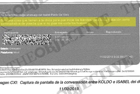 El primer mensaje se produce el 11 de febrero de 2019. Koldo García pide a Pardo de Vera urgencia en el trámite de la contratación. «Solo una cosa, que llamen a la chica para que inicie los trámites para la contratación como administrativa de Joseba, que si no José me corta los huevos». Pasan casi dos semanas y la expresidenta de ADIF contesta al asesor ministerial: «Están ya con ello. Mañana le llaman, no se puede dar de alta sin seguir un procedimiento».