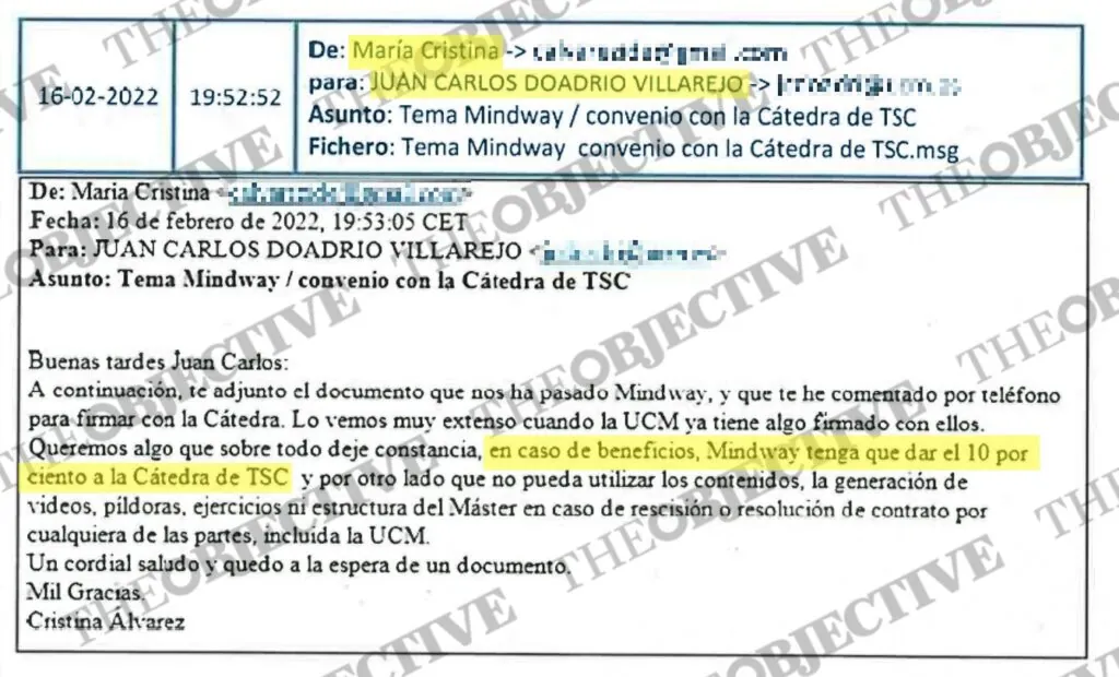 El contenido de los correos revela que Álvarez participó en las adendas de colaboración de una docena de empresas, entre las que se encuentran Google, Deloitte, ONCE y la pública Indra. La asesora de Begoña Gómez en Moncloa también negoció patrocinios y un convenio de formación permanente con Mindway: «Queremos algo que sobre todo deje constancia, en caso de beneficios, Mindway tenga que dar el 10 por ciento a la cátedra de TSC (Transformación Social Competitiva)», escribió la asistente a Doadrio el 16 de febrero de 2022.