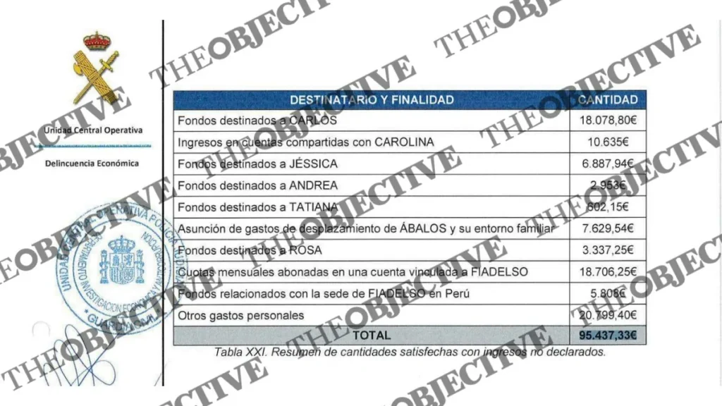 La UCO también ha detectado pagos del exministro por valor de 95.437 euros que no tienen rastro bancario. Ese dato refuerza la existencia de «ingresos en efectivo no declarados» en los años en los que se centra la investigación, que coinciden con los que Ábalos estuvo al frente de la cartera de Transportes. Los agentes destacan un montante de 20.799 euros de gastos «personales con cargo a una fuente de ingresos no declarada». Otros destinatarios de esos fondos serían su exmujer Carolina Perles, sus hijos Carlos y Tatiana, Andrea de la Torre y la propia Jésica Rodríguez.