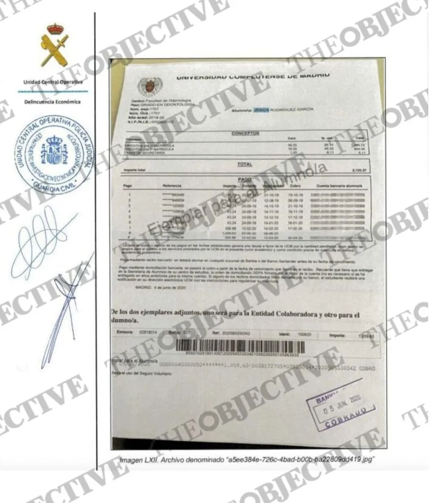 Ábalos remitió el 4 de junio de 2020 un documento en formato PDF a Koldo García con las señas de la matrícula universitaria de Jésica Rodríguez. El papel incluye datos personales de la joven, a la que denominan en clave «España», y los diferentes créditos a cursar. El pago se produce por un importe de 1.059 euros, aunque el total asciende a 2.125 euros. Un día más tarde, el asesor escribió al exministro un escueto mensaje a través del WhatsApp: «España hecho». La entidad bancaria selló el documento como «cobrado».