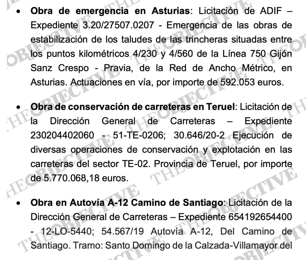 La UCO ha desvelado en anteriores informes que Ruz también estrechó su relación con el propio Ábalos, con reuniones presenciales «tanto en el Ministerio como fuera de este, e incluso en diversas ocasiones en su propio domicilio». En los pendrives intervenidos al empresario y a LIC durante la entrada y registro practicada el pasado junio afloraron indicios de manipulación de concursos en favor de la constructora. Allí se hallaron referencias a las adjudicaciones de la Autovía de Santiago A-2, diversos trabajos de emergencia en Asturias y otros en Melilla, Teruel o Motril. Los agentes han hallado irregularidades en al menos tres de ellos.