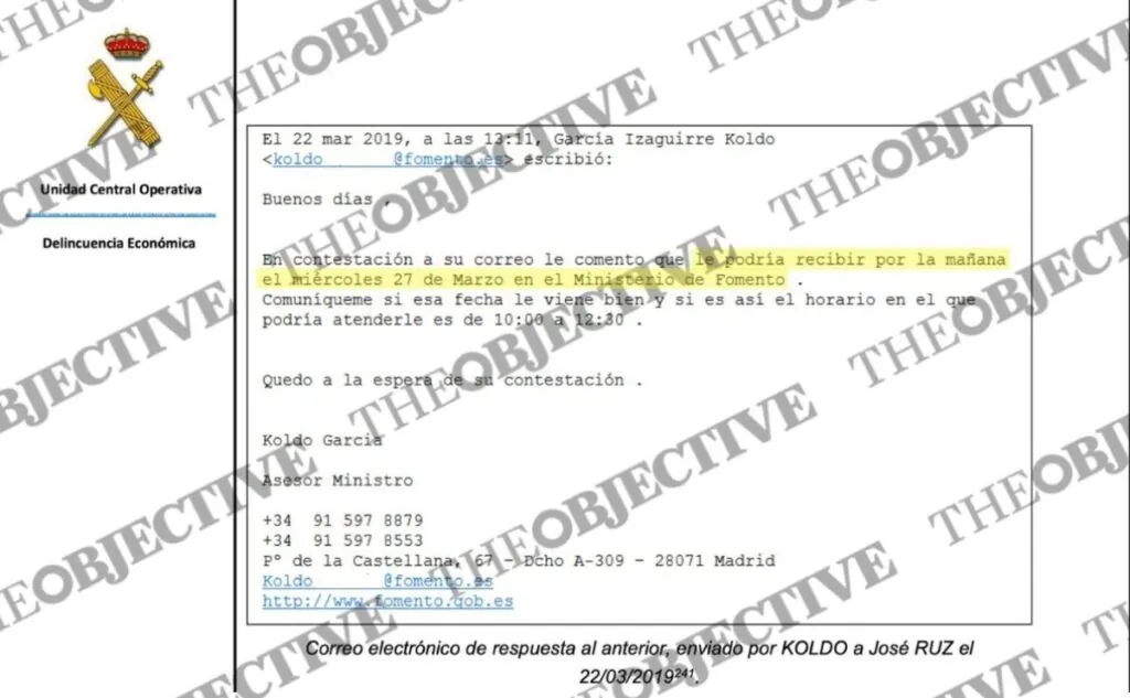 El asesor ministerial respondió a la solicitud días más tarde, el 22 de marzo. «Le podría recibir por la mañana el miércoles 27 de marzo en el Ministerio de Fomento», le indica. Firma el correo como «Koldo García. Asesor Ministro». La UCO acredita en su investigación que, efectivamente, esa reunión se produjo en la sede del ministerio que dirigía entonces Ábalos. Se desconoce si el exdirigente socialista acudió a ella, pero es posible que se encontrara en su despacho, ya que en esa fecha no tenía agendado ningún acto oficial.