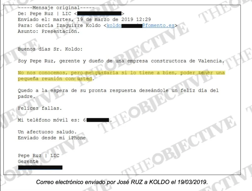 Diez días antes de aquella conversación de las «2.000 txistorras», el 19 de marzo de 2019, Koldo García recibió a media mañana un mensaje con un escueto asunto: «Presentación». «Buenos días, señor Koldo: Soy Pepe Ruz, gerente de una empresa constructora de Valencia. No nos conocemos, pero me gustaría si lo tiene a bien, poder tener una pequeña reunión con usted». La UCO subraya que el accionista de LIC había obtenido el contacto (e información como su paternidad) de su socio común Víctor de Aldama, al que se referían como pitbull o niño.