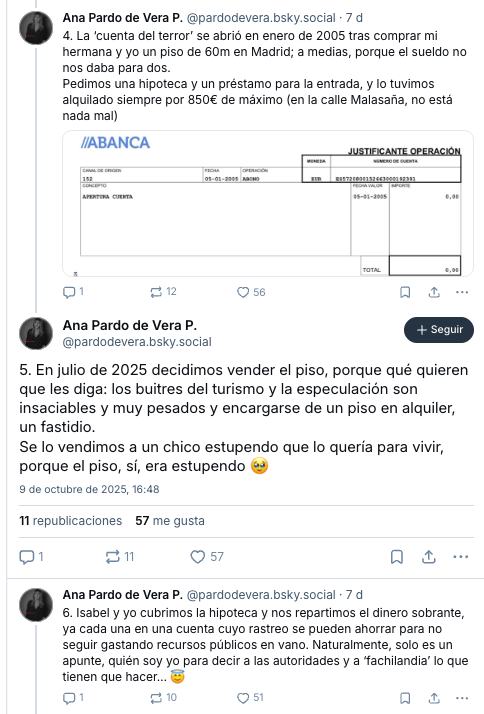 Esa «cuenta del terror», como la ha bautizado sarcásticamente Ana Pardo de Vera, se abrió en enero 2005 en Abanca (antes Caixa Galicia) «tras comprar mi hermana y yo un piso de 60 m² en Madrid, a medias, porque el sueldo no nos daba para dos», explica la autora del hilo. «Pedimos una hipoteca y un préstamo para la entrada, y lo tuvimos alquilado siempre por 850 euros de máximo (en la calle Malasaña, no está nada mal)», precisa.