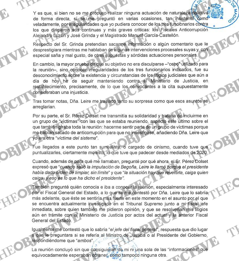 Sobre Pérez Dolset, Stampa explica que «me trasmitía su solidaridad y trataba de incluirme en un grupo de ‘víctimas’ con las que se estaba reuniendo, aspecto este último sobre el que también giraba toda la reunión: hacerme sentir parte de un grupo de víctimas porque me habían sacado de anticorrupción para que no investigase, añadiendo Doña Leire que yo era otra ‘víctima del sistema’», relata.