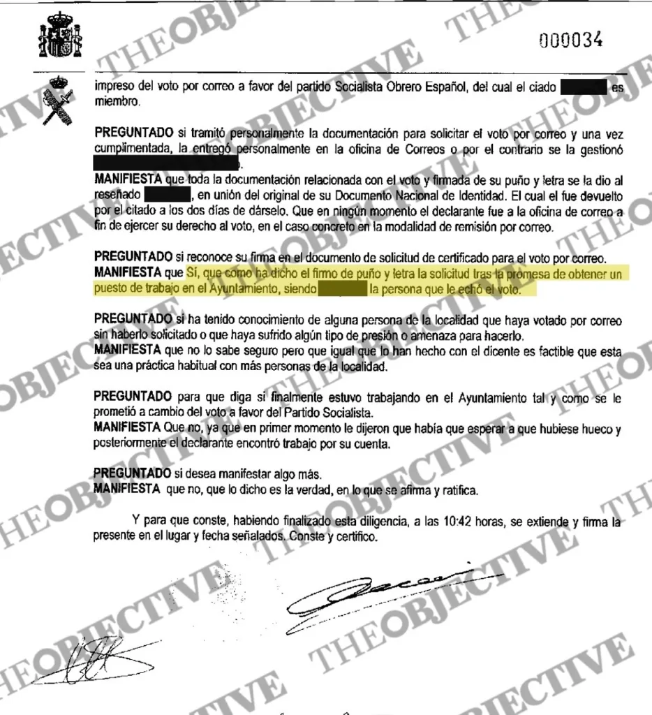 «Me ofreció un puesto de trabajo en el Ayuntamiento por tiempo de un mes, a cambio de firmar el impreso de voto por correo a favor del PSOE», declaró sin titubeos. Afirmó que nunca ejerció personalmente su derecho al voto: lo hizo un tercero por él, con su autorización y documentos. La promesa laboral no se materializó. En un primer momento, según explicó a los investigadores, le dijeron que debía esperar a que se liberara un puesto. Finalmente, encontró trabajo por su cuenta. Nunca fue contratado por el Ayuntamiento. Los investigadores preguntaron si tramitó personalmente su solicitud de voto postal. El testigo respondió que no: «Toda la documentación se la di a B.D.A. en mano, junto con su DNI. Él gestionó todo. Yo no fui a Correos ni voté personalmente».
