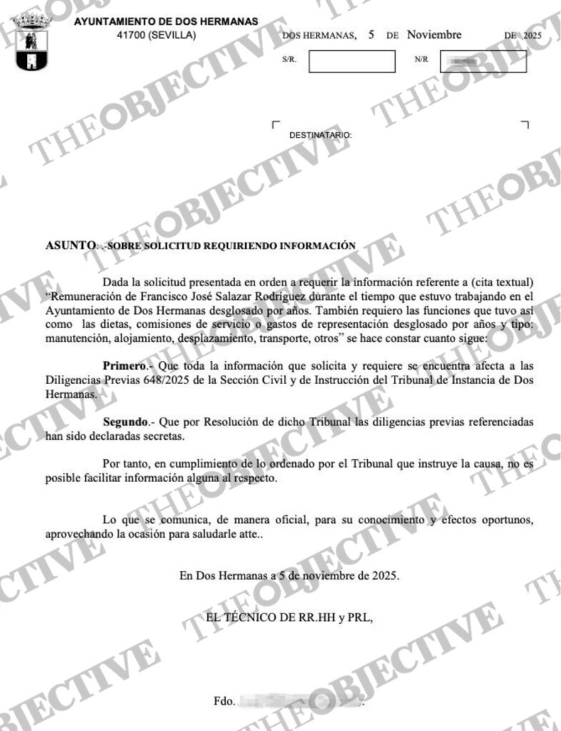 La novedad ahora es que en un posterior escrito ha declarado secretas las pesquisas. Así lo desvela el propio Ayuntamiento de Dos Hermanas en respuesta a una solicitud de información de un particular sobre la cuantía de los emolumentos que recibió Salazar en ese período. «Por resolución de dicho Tribunal, las diligencias previas referenciadas han sido declaradas secretas. Por tanto, en cumplimiento de lo ordenado por el Tribunal que instruye la causa, no es posible facilitar información alguna al respecto», replicó el consistorio el pasado 5 de noviembre en un escrito al que ha tenido acceso THE OBJECTIVE (leer abajo).