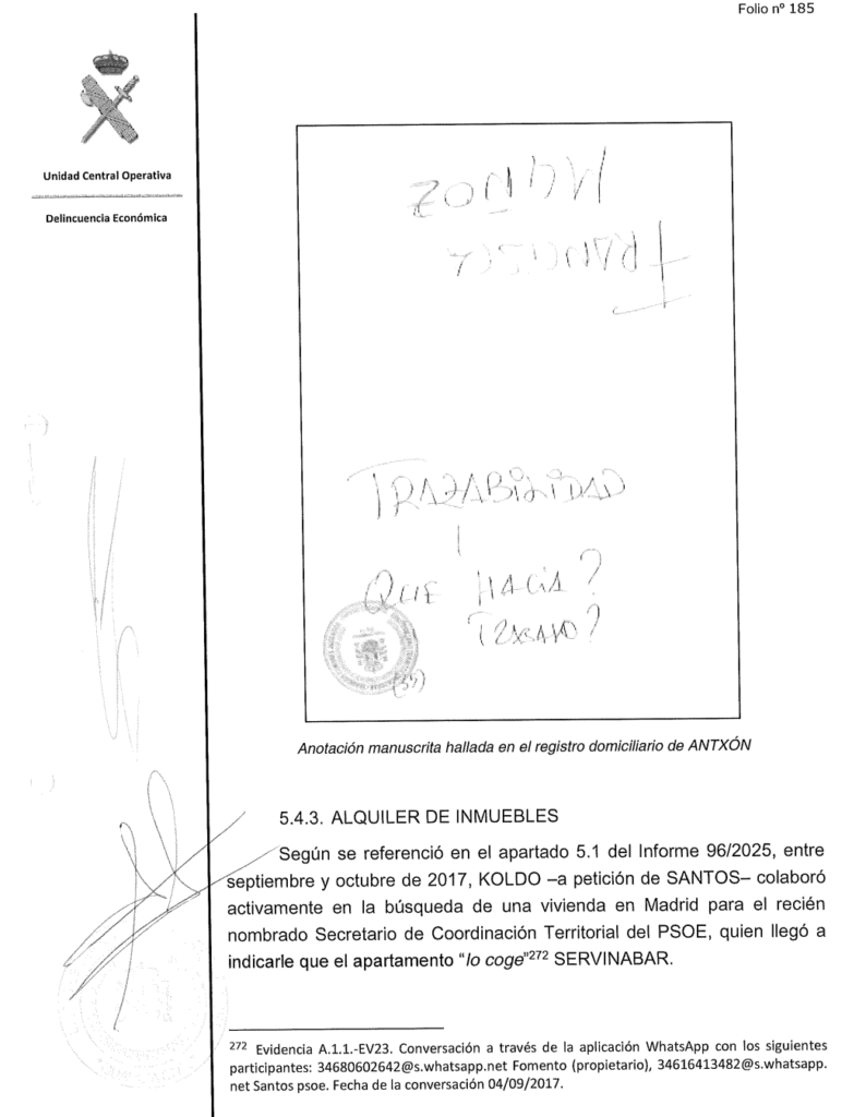 «Del análisis de los dispositivos y demás documentación física o digital, intervenida en los domicilios de Antxon y Servinabar, no se han localizado documentos, cruce de correos electrónicos o en general cualquier atisbo de actividad de la que se desprenda una verdadera prestación de servicios por parte de Francisca Muñoz en la sociedad cooperativa. Sobre este particular, cabría reseñar que durante el registro domiciliario de Antxon, entre otros documentos, afloró una hoja de papel con la siguiente anotación manuscrita: ‘Francisca Muñoz Trazabilidad Que hacía? Trabajo?’», concluye la Guardia Civil (ver abajo).