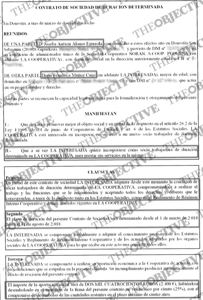 En dicho contrato, se especifica la entrada de Muñoz en la cooperativa, atendiendo a la cláusula tercera del contrato, que conllevó una aportación de 2.400 euros al capital social de Noran por parte de ella. Además, el 25% de dicha aportación -un total de 600 euros- se entregó a la firma del mismo, según consta en el escrito. «No obstante, no se ha encontrado respaldo justificativo en cuentas bancarias de las cantidades que, en virtud de este acuerdo, Francisca Muñoz estaba obligada a desembolsar como aportación de socios a la cooperativa», subraya la UCO.
