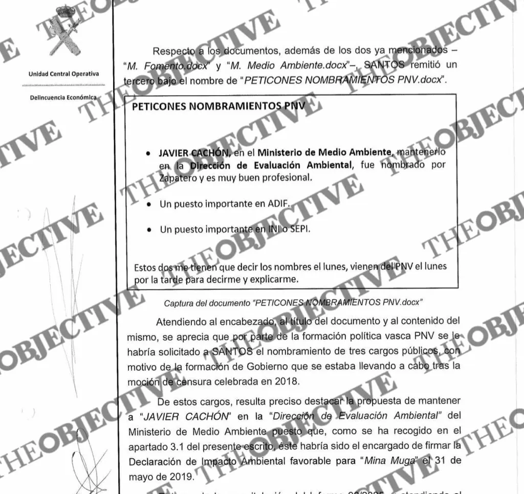 La UCO interpreta que estas tres peticiones fueron planteadas por el PNV como contrapartida a su apoyo a la moción de censura, que se saldó con 180 votos a favor, entre ellos los seis escaños peneuvistas, frente a 169 en contra y una abstención. El informe destaca especialmente la primera de las solicitudes: mantener a Javier Cachón de la Iglesia al frente de la Dirección General de Calidad y Evaluación Ambiental. Cachón, nombrado en su día por el Gobierno de José Luis Zapatero, firmaría el 31 de mayo de 2019 la Declaración de Impacto Ambiental (DIA) favorable al proyecto minero Muga, en Navarra, promovido por la empresa Geoalcali (participada por Highfield Resources y con vínculos indirectos con Acciona). Este proyecto había sido paralizado en varias ocasiones por informes negativos previos.