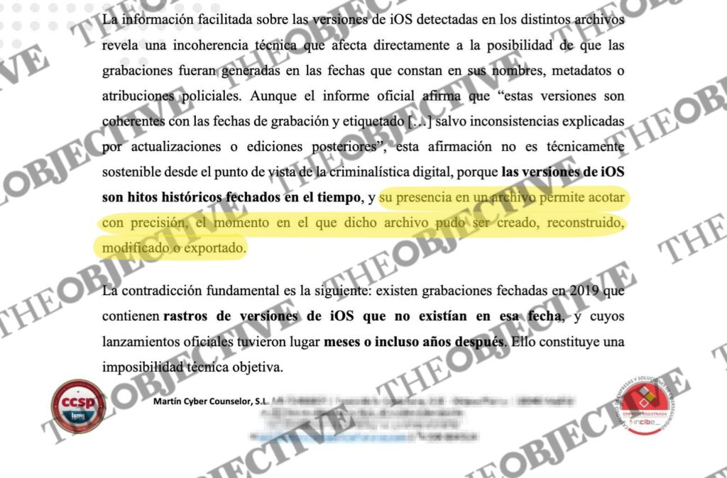 «La información facilitada sobre las versiones de iOS detectadas en los distintos archivos revela una incoherencia técnica que afecta directamente a la posibilidad de que las grabaciones fueran generadas en las fechas que constan en sus nombres, metadatos o atribuciones policiales. Aunque el informe oficial afirma que estas versiones son coherentes con las fechas de grabación y etiquetado […] salvo inconsistencias explicadas por actualizaciones o ediciones posteriores, esta afirmación no es técnicamente sostenible desde el punto de vista de la criminalística digital, porque las versiones de iOS son hitos históricos fechados en el tiempo, y su presencia en un archivo permite acotar con precisión, el momento en el que dicho archivo pudo ser creado, reconstruido, modificado o exportado», revela el informe registrado por Cerdán.