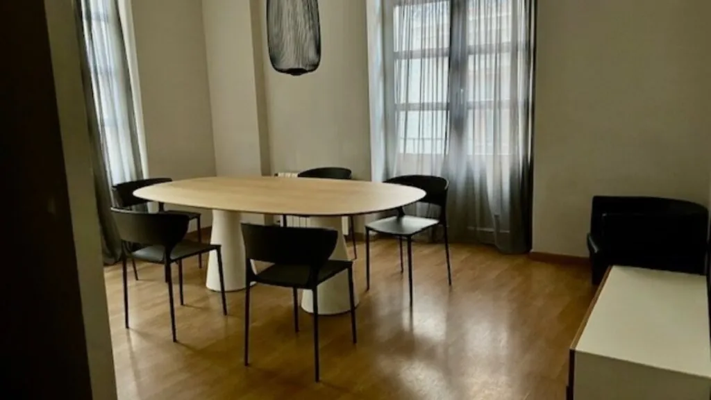 Además, ha entregado el plano en planta de dicha habitación, que tiene 4,43 metros de largo por 2,83 de ancho. Se trata de una habitación, con dos grandes ventanales de techo a suelo con cortinas, una mesa ovalada en el centro con varias sillas, un sillón y un mueble auxiliar.