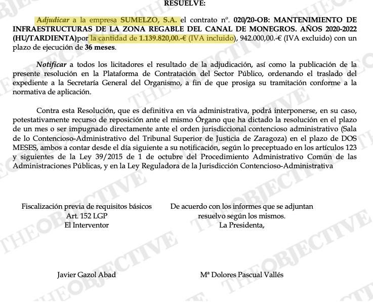 Las fechas de esa operación son uno de los principales focos de sospecha. El pago se registra en los últimos meses del año, en el cuarto trimestre. Justo en el momento en que Sumelzo S.A. se había llevado la adjudicación del «mantenimiento de infraestructuras de la zona regable del Canal de Monegros. Años 2020-2022» por parte de la Confederación Hidrográfica del Ebro (CHE), dependiente del Ministerio de Transición Ecológica, que en aquel momento dirigía Teresa Ribera.