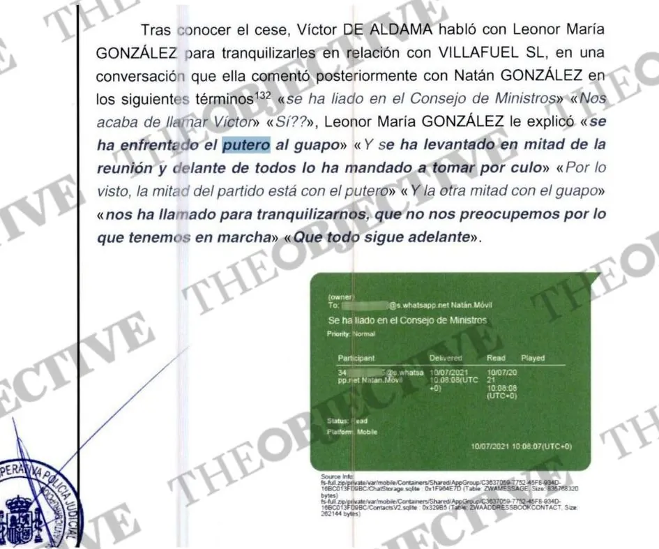 Por otra parte, en las conversaciones intervenidas también se refleja como desde Villafuel hubo quien trató de desvincularse de las presiones que estaban ejerciendo a través de Koldo García. Es el caso de Maria Luisa Rivas, hermana de Claudio Rivas (socio de Aldama), que según el informe dio orden para solicitar «formalmente y sin presión» una reunión en el ministerio.