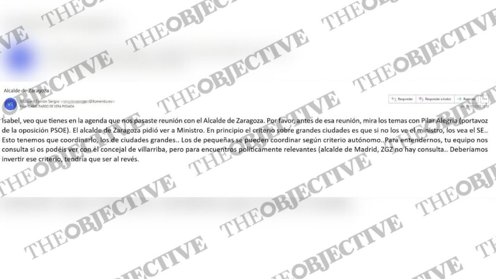 «Isabel, veo que tienes en la agenda que nos pasaste reunión con el alcalde de Zaragoza. Por favor, antes de esa reunión mira los temas con Pilar Alegría (portavoz de la oposición PSOE). El alcalde de Zaragoza pidió ver al ministro [Ábalos]. En principio, el criterio sobre grandes ciudades es que, si no los ve el ministro, los vea el SE [secretario de Estado de Transportes]. Esto tenemos que coordinarlo, los de ciudades grandes. Los de pequeñas, se pueden coordinar con criterio autónomo», escribió Vázquez a Pardo de Vera.