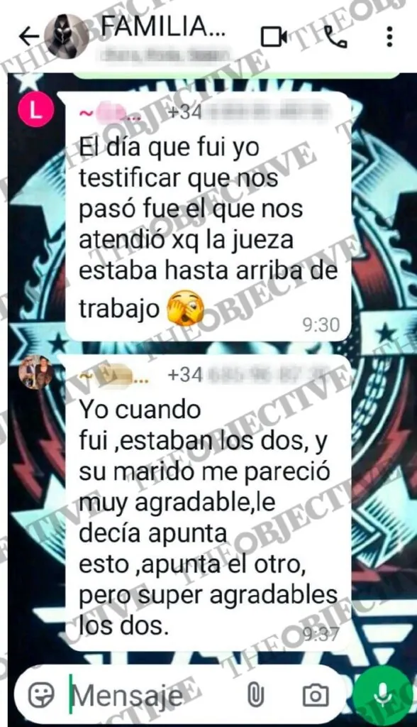 En el chat se puede ver a una persona quejándose de cómo el marido de la juez le atendió en la testificación alegando esta estar «hasta arriba de trabajo», a lo que otra responde: «Yo cuando fui, estaban los dos, y su marido me pareció muy agradable, le decía apunta esto, apunta lo otro, pero súper agradables los dos».