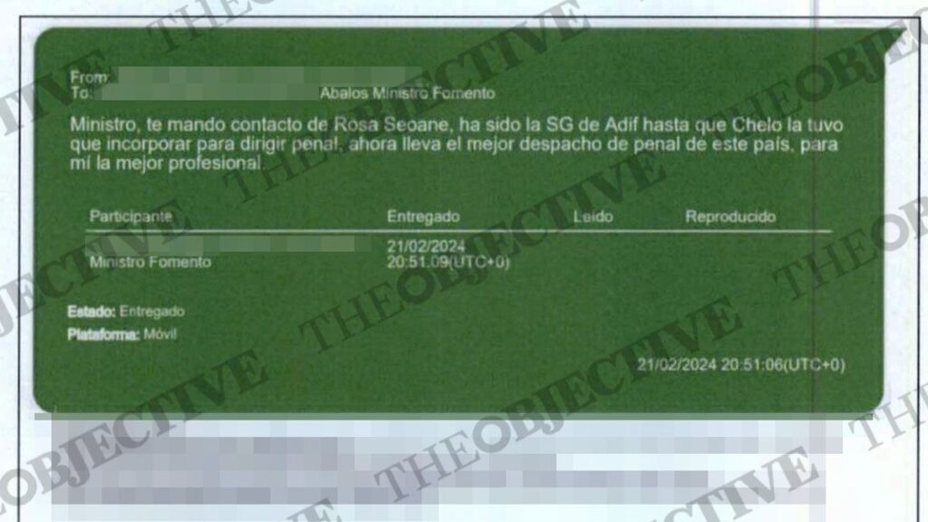 En un oficio de la Guardia Civil al juez de instrucción del Tribunal Supremo del Caso Mascarillas que ha tenido acceso THE OBJECTIVE, se muestra cómo la expresidenta de ADIF llamó «unas horas más tarde» de declarar al exministro para indicarle que debía conversar con su abogada, Rosa María Seoane. «Ministro, te mando contacto de Rosa Seoane, ha sido la SG (Secretaria General) de ADIF hasta que Chelo la tuvo que incorporar para dirigir penal, ahora lleva el mejor despacho de penal de este país, para mí la mejor profesional», escribe Pardo de Vera a Ábalos.