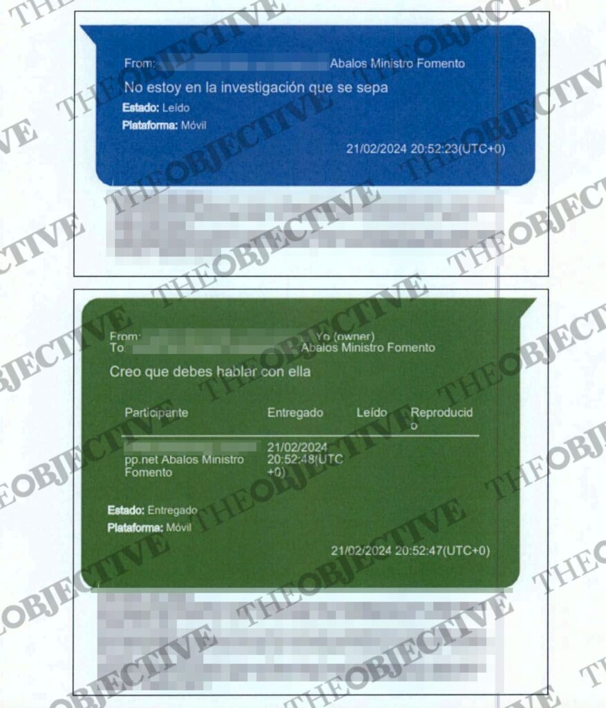 La respuesta de Ábalos a Pardo de Vera fue de «sorpresa» -según los agentes-, ya que no entendía porque le recomendaba contactar con su abogada. «No estoy en la investigación que se sepa», le respondió el ministro. Tras ello, es cuando la expresidenta de ADIF contesta: «Creo que debes hablar con ella». Pardo de Vera le invita a continuar la conversación a través de llamadas telefónicas. «De esta forma, se aprecia que ISABEL recurre a encuentros presenciales, evitando dejar constancia por escrito de determinadas cuestiones con afectación directa a las personas investigadas», señala el oficio de la Guardia Civil.
