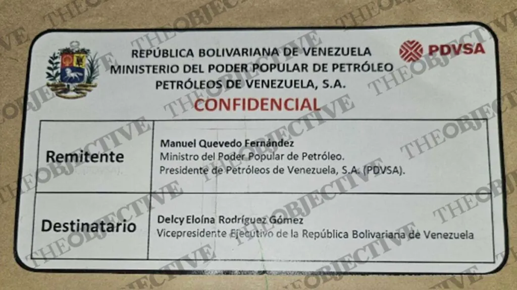 Los agentes de la UCO desconocen todavía qué contiene exactamente el sobre, que lleva impreso el membrete oficial: «República Bolivariana de Venezuela. Ministerio del Poder Popular de Petróleo. Petróleos de Venezuela S. A. Confidencial». El remitente es Manuel Quevedo, quien ocupó el cargo de ministro del Petróleo y presidente de PDVSA entre noviembre de 2017 y abril de 2020, y el destinatario señalado es Delcy Rodríguez. El paquete, de color marrón, está fechado el 4 de febrero de 2020.