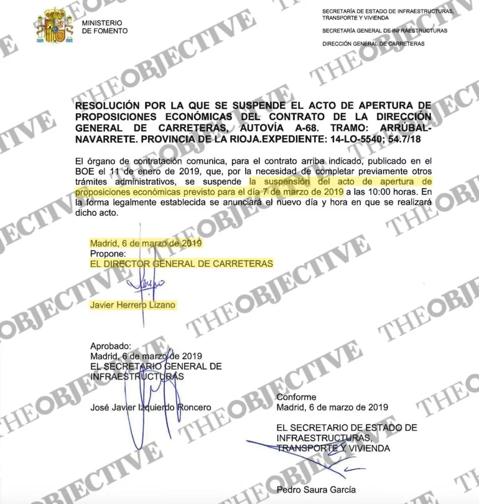 En el documento aparecen las firmas del exdirector de Carreteras y de quienes ostentaban en ese momento la Secretaría General de Infraestructuras, José Javier Izquierdo, y la Secretaría de Estado de Infraestructuras, Transporte y Vivienda, Pedro Saura. La Audiencia Nacional investiga a Herrero por cinco delitos por el presunto amaño de obras públicas a cambio de comisiones, una derivada del caso Koldo: organización criminal, tráfico de influencias, malversación de caudales públicos, prevaricación y cohecho.