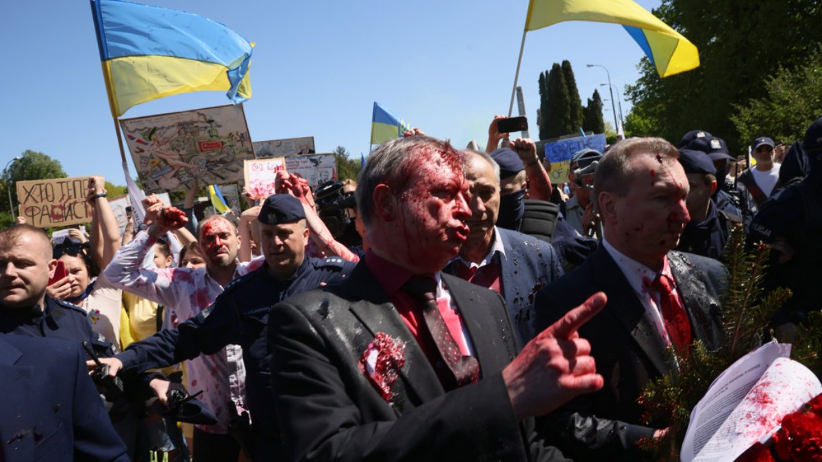 El representante del Kremlin fue teñido de rojo cuando celebraba el Día de la Victoria en el país en el que estaba destinado