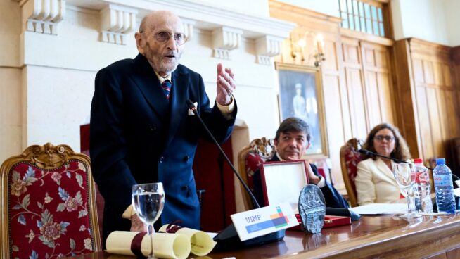 En silla de ruedas, Pombo ha presenciado la lectura de su discurso en el paraninfo universitario