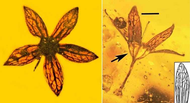 Eche un vistazo a la Figura 1 (la de arriba), un fósil de 100 millones de años de una flor conservada en ámbar desde el período Cretácico y descrita en 2017 por George Poinar, profesor de la Universidad del Estado de Oregón (EE UU), en la revista Palaeodiversity. Es uno de los siete ejemplares completos de flores conservados en ámbar en un yacimiento de Myanmar.