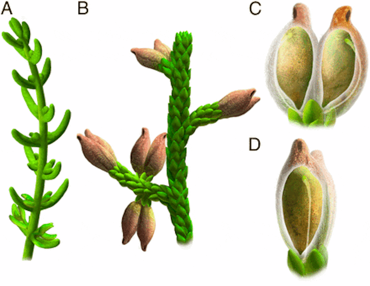 Como pueden ver en la Figura 2, tomada de la publicación original, la española Montsechia vidalii no hubiera sido de mucha utilidad en una floristería. Consistía en brotes largos y hojas pequeñas, y sus flores carecían de algo tan elaborado como pétalos. Pero, dada su antigüedad, esta planta acuática es una ventana abierta a los primeros días de las angiospermas.