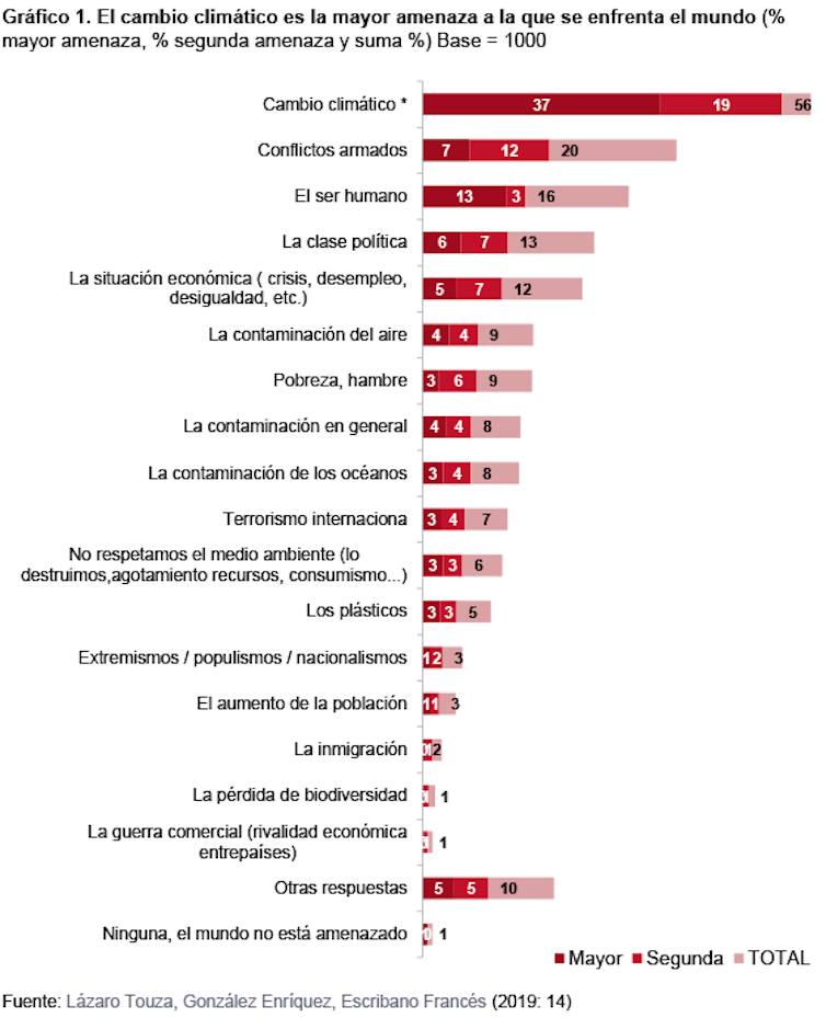 Los ciudadanos españoles perciben el cambio climático como la mayor amenaza para el mundo (véase el gráfico 1).