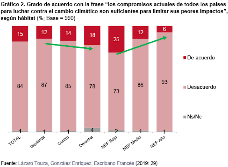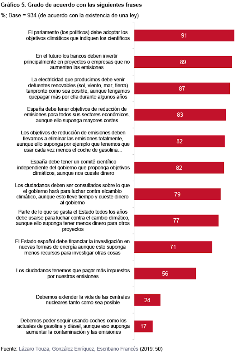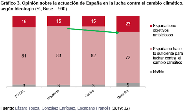 Sin embargo, por lo general, las posturas más proecológicas y la preocupación por el clima están presentes en todos los grupos sociodemográficos e ideológicos, demostrando un fuerte apoyo a una Ley de Cambio Climático y de Transición Energética, así como a los elementos clave de las leyes climáticas que existen en otros países: