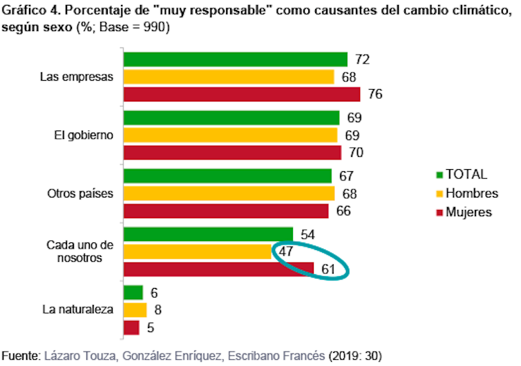 Los encuestados ven a las compañías, al gobierno y a otros países como los grandes responsables del cambio climático, pero son menos los que reconocen su propia responsabilidad. Es interesante observar que las mujeres reconocen su responsabilidad como causantes del cambio climático en mayor medida que los hombres (véase el Gráfico 4).
