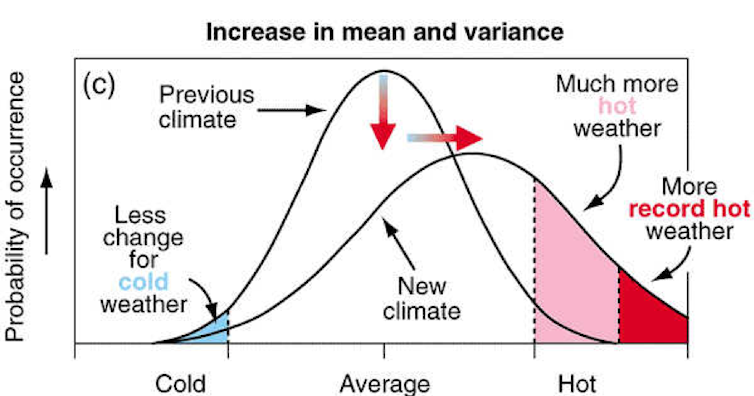 Dicho de un modo más visual, se están estirando las colas de la distribución. Por eso cada vez hay más olas de calor, meses y años más cálidos, y algunos extremadamente cálidos, sin dejar de haber episodios fríos. Nuestra campana de Gauss se ha desplazado hacia unos valores más altos de temperatura, es decir, muestra una media más elevada, pero, al tiempo, se ha aplastado y se han estirado sus colas.