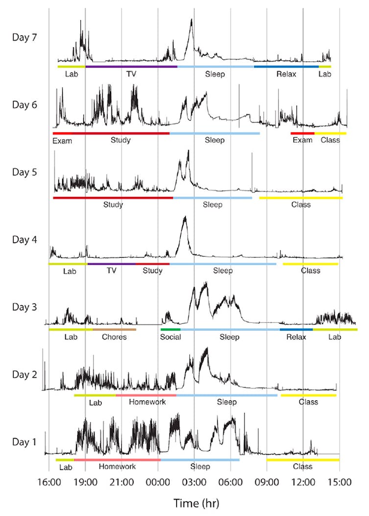 El experimento real ilustrado en la figura 1 muestra la actividad cerebral de un estudiante a lo largo de la semana. Se observa que hay momentos del día en los que el cerebro está más activo y receptivo (picos), y otros en los que la actividad es similar a la de un encefalograma plano. ¿Os imagináis qué momentos del día son esos? Las clases. Precisamente el lugar donde la transmisión de conocimientos debiera ser mayor.