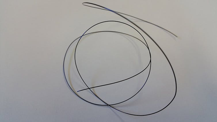Y sin embargo, algo tan delicado y sutil como un tallo tiene la fuerza para revolucionar el mundo de la robótica de rehabilitación. Ni yo misma lo hubiera creído hasta que un grupo de científicos con los que trabajo me enseñó el arma secreta que se esconde detrás del hilo con forma de ramita de la figura 6. Se trata de una aleación con memoria de forma, y se llama así porque tiene la propiedad de contraerse cuando se calienta y de recordar y recuperar su longitud original cuando se enfría. Al igual que un tallo, este hilo reacciona también, a su manera, a los cambios de temperatura.