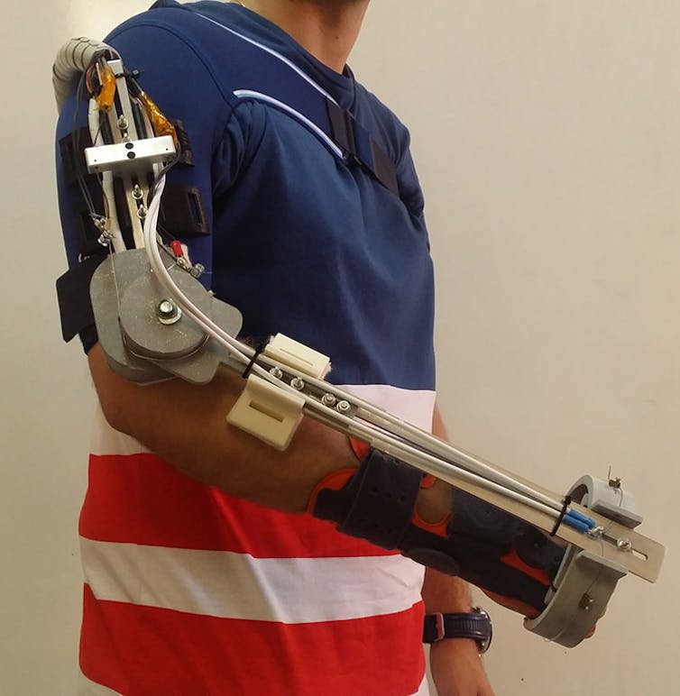 Convenientemente distribuidos a lo largo de un dispositivo robótico que se acopla a nuestro brazo, al que llamamos exoesqueleto, estos hilos actúan de manera que, cuando se calientan haciendo pasar por ellos una corriente, se contraen y tiran del brazo permitiendo su flexión, y cuando se enfrían al cesar la corriente, se elongan y permiten la extensión del mismo. Dispositivos como éste (figura 7) están revolucionando el campo de la robótica asistencial, ayudando a pacientes que han sufrido un ictus a rehabilitar de manera efectiva sus extremidades afectadas.