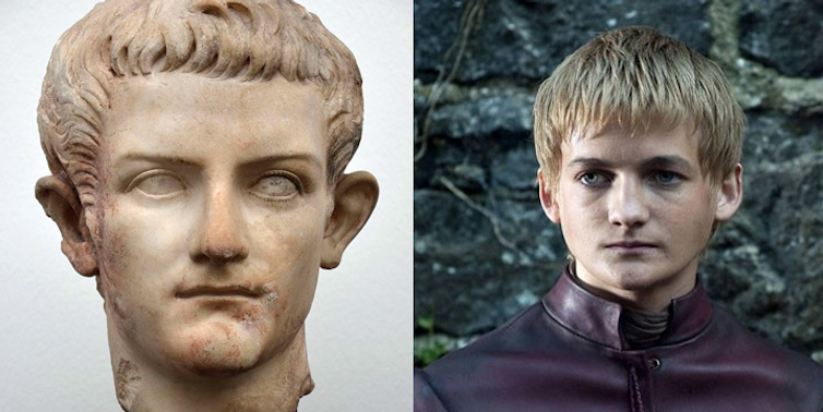 En Juego de tronos también encontramos varias adaptaciones de personajes políticos de la Roma imperial. Al contrario que Julio César, que fue una figura muy positiva, Calígula, tercer emperador romano, representa al César delirante. Suetonio, autor de Vidas de los doce césares, nos describe a un tirano violento e imprevisible. Calígula presenta tres características principales: es joven, cruel y demente.