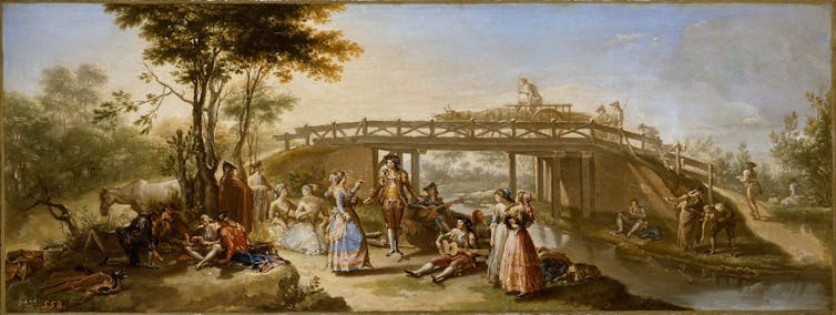 Francisco Bayeu nos lleva a los pies del puente del Canal. Las distendidas actividades de los jóvenes burgueses, ricamente ataviados, contrastan con la acción central. La pareja baila unas seguidillas, con su braceo típico, al son de las guitarras y castañuelas.