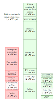 En realidad los datos oficiales del IDAE (Instituto para la Diversificación y Ahorro de la Energía) del Ministerio para la Transición Ecológica dicen que el consumo de energía primaria es de 85 kWh por persona y día. Son buenas noticias: el consumo actual es inferior al potencial renovable (183 kWh/p/d), pero recordemos la gran industrialización del terreno necesaria para abastecer todo este consumo con energías renovables.