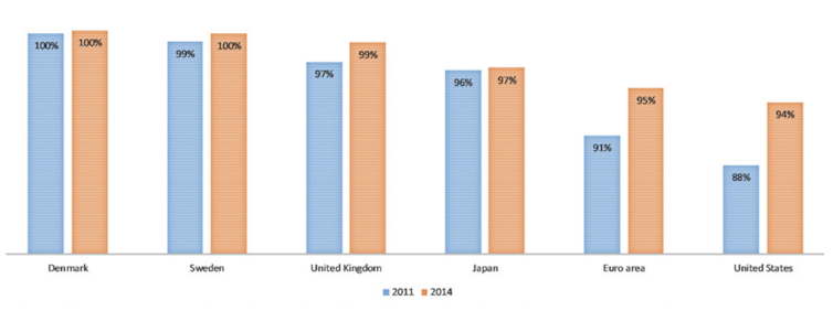 Los resultados demuestran que, aunque la Eurozona es un área con una elevada inclusión financiera, la participación de los ciudadanos en el sector bancario es relativamente menor que en otros países de nivel de desarrollo similar como es el caso de los países nórdicos (Suecia y Dinamarca), Reino Unido o Japón. En consecuencia, también utilizamos más el efectivo a la hora de hacer pagos.